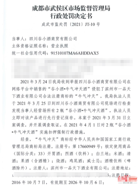2022年3月24日,谷小酒公司收到了一份由武侯区市场监督管理局下达的《行政处罚决定书》,称其公司销售的“谷小酒·牛气冲天”酒侵犯了一品天下公司的权益,被认定违法,罚款2835493.56元。