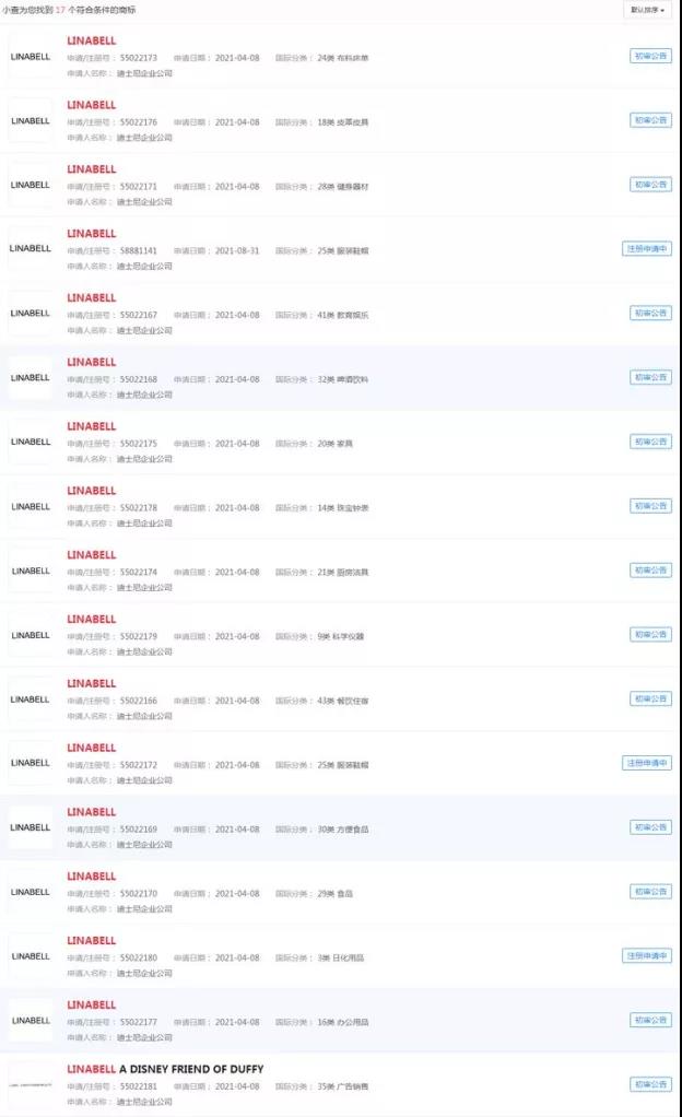 通过企查查搜索,目前只有迪士尼企业公司于今年4月8日申请注册的“LINABELL”及“LINABELL A DISNEY FRIEND OF DUFFY”商标,总共有17件,其中已有14件已初审公告,余下3件处于注册申请中的状态。