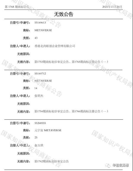 让一些申请人更伤心的是,商标局对之前已经初审公告或者注册公告的部分含有“元宇宙”或“meta”字样的商标进行了无效公告。啥意思呢?就是之前的初审公告和注册公告不算数了,统统做废!